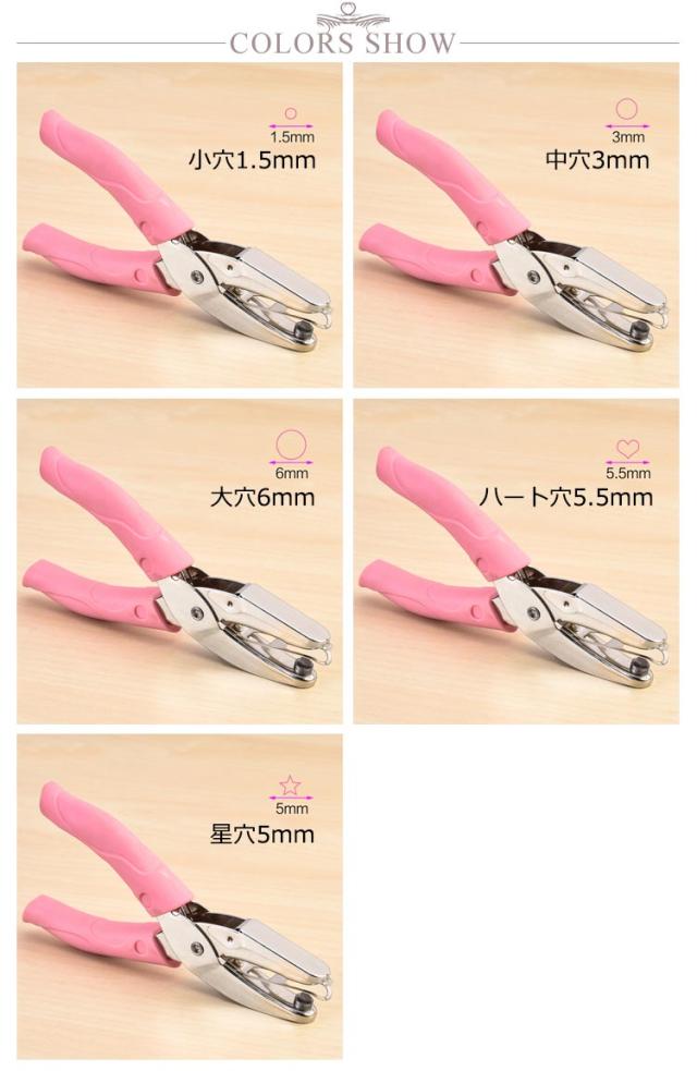 | サイズ | 小穴1.5mm 中穴3mm 大穴6mm ハート穴5.5mm 星穴5mm |