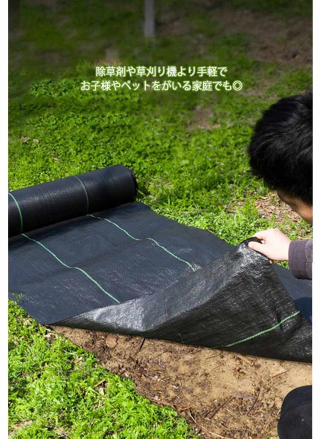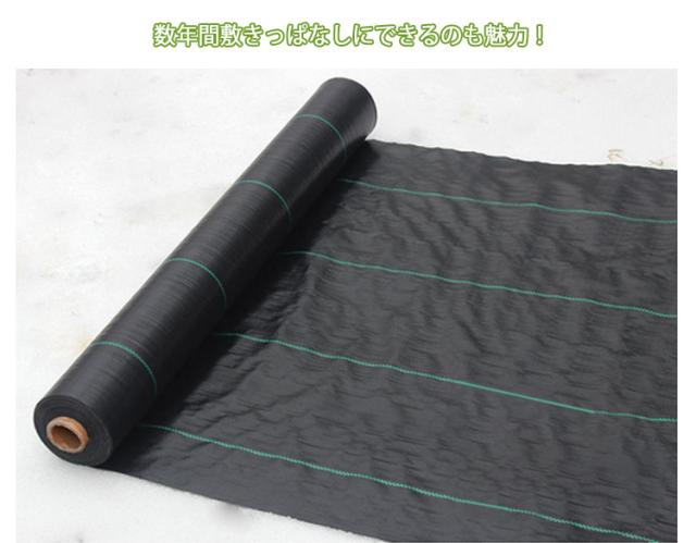 | 幅0.5m*長さ200m!高密度・平織の生地を使用した、高耐久の防草シート。 耐用年数約7-12年 日光を遮断し雑草の光合成を抑える事で、何度抜いても生えてくる雑草を枯れさせて再発生を防ぎます。 地面を雑草が生えにくいコンクリートで固めるのには、かなりの費用がかかりますが防草シートならとっても経済的で手軽。 地面の土はそのままなので、あとから家庭菜園スペースや花壇に変更するのも簡単です。 除草剤や草刈り機より手軽でお子様やペットをがいる家庭でも◎ 数年間敷きっぱなしにできるのも魅力! | |