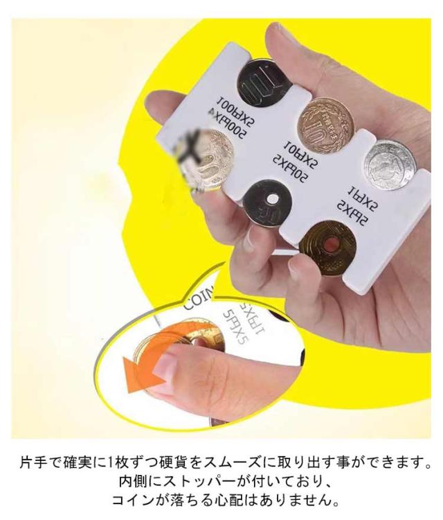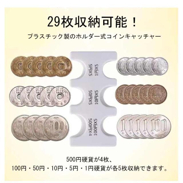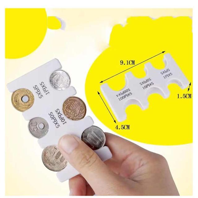 | 29枚収納可能!プラスチック製のホルダー式コインキャッチャー 500円硬貨が4枚、100円・50円・10円・5円・1円硬貨が各5枚収納できます。 片手で確実に1枚ずつ硬貨をスムーズに取り出す事ができます。 内側にストッパーが付いており、コインが落ちる心配はありません。 財布やポケット中のコインを簡単に片付ける!バッグの中から取り出すときも小銭が落下することはありません。 駅でもコンビニでも、コインホルダーからコインを簡単に取り出すことができます。 お得な2点セット、大人だけでなくお金を持ち始めた小さな子供にもおすすめです。 | |