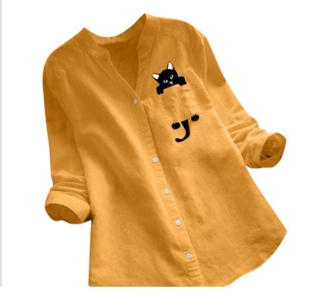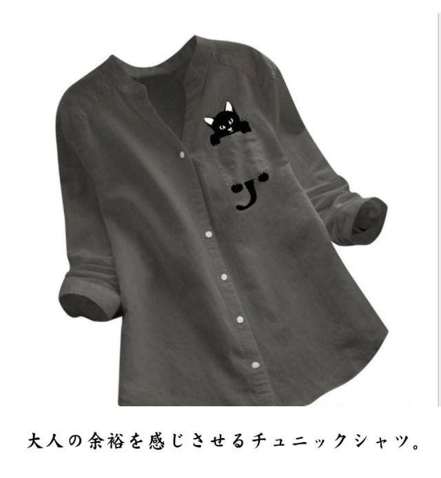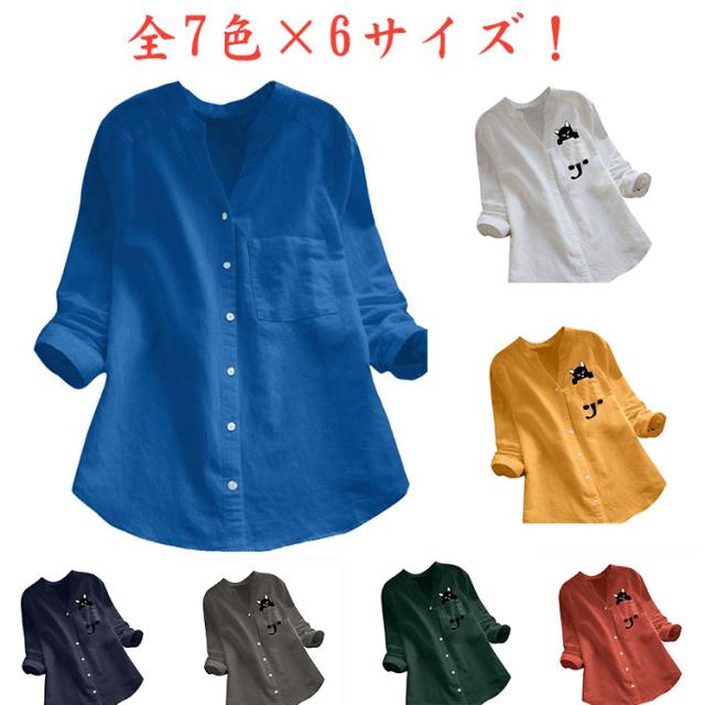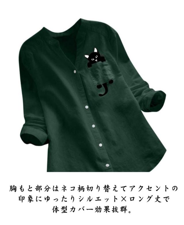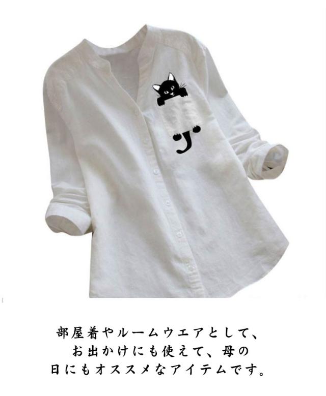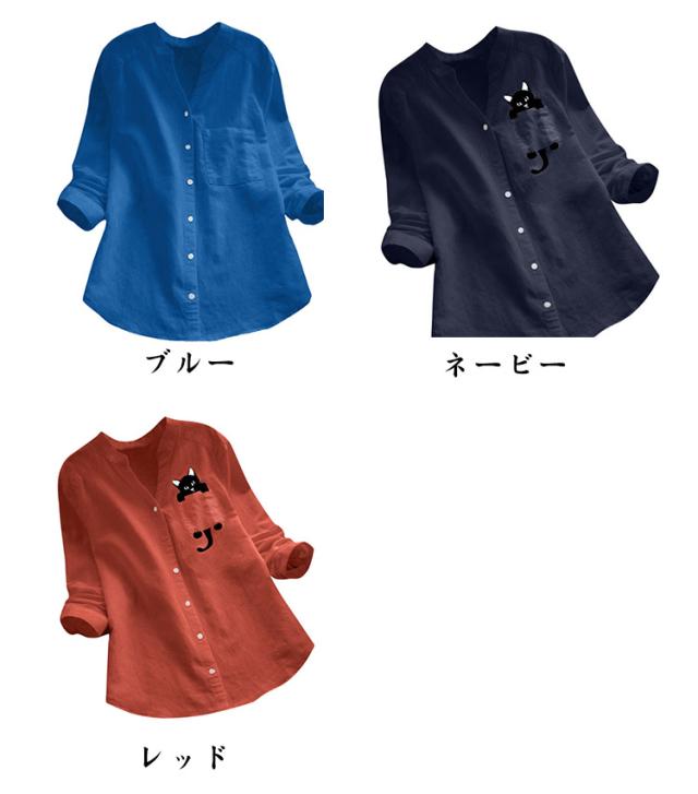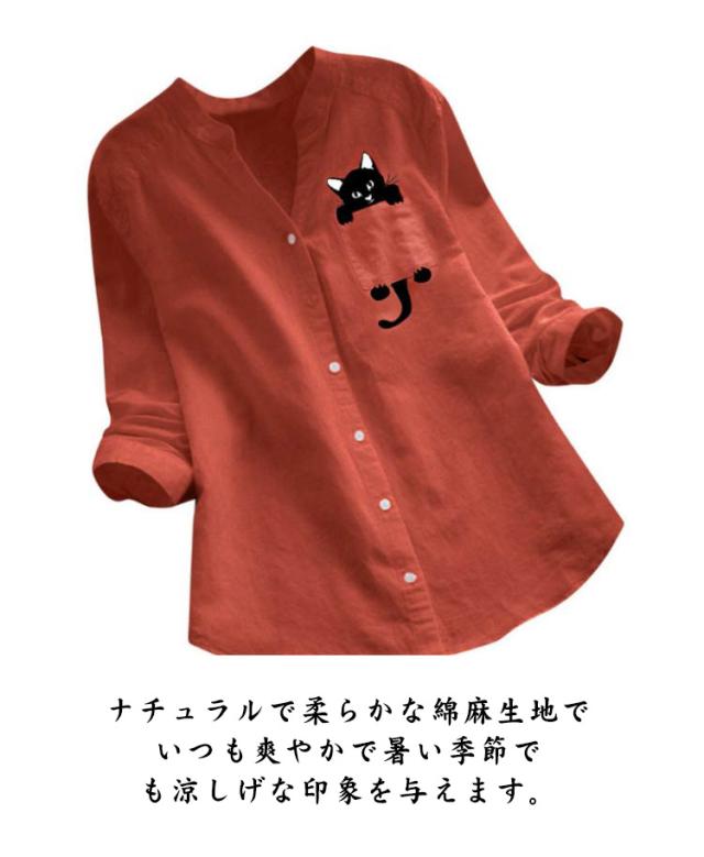 シャツ 猫柄 春 レディース ナチュラル Vネック トップス シンプル 長袖シャツ ブラウス 秋 綿麻 ネコ柄 ゆったり 夏 猫 20代 30代 40代