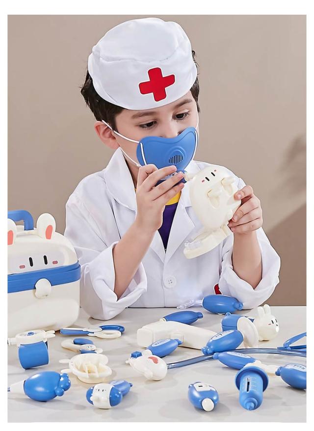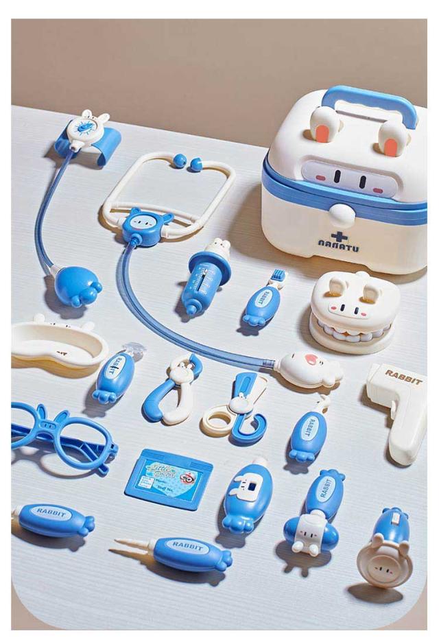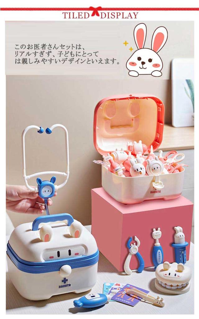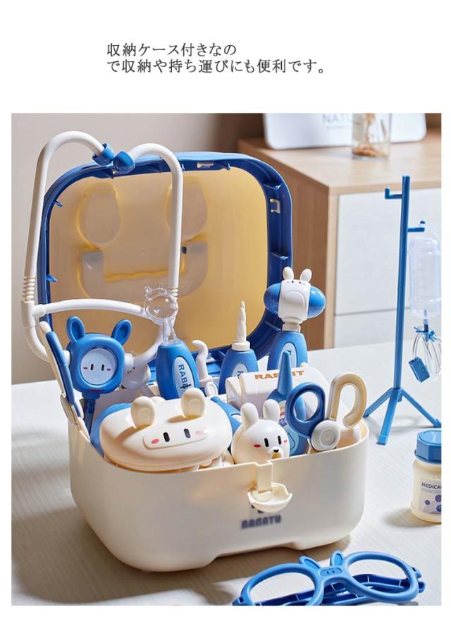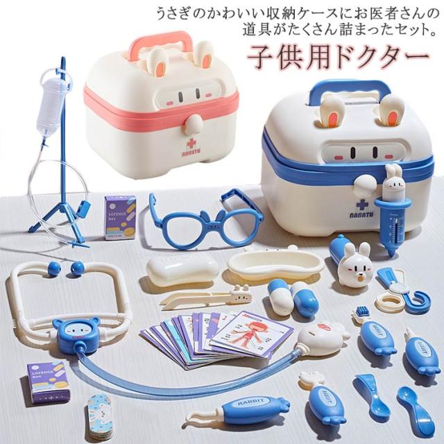 | うさぎのかわいい収納ケースにお医者さんの道具がたくさん詰まったセット。 このお医者さんセットは、リアルすぎず、子どもにとっては親しみやすいデザインといえます。 収納ケース付きなので収納や持ち運びにも便利です。 楽しくお医者さんごっこで遊ぼう! | |