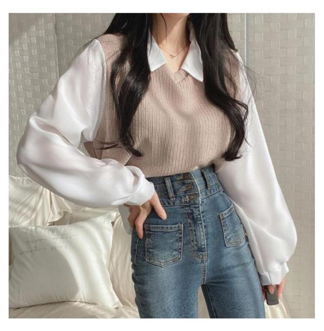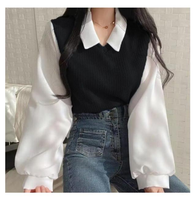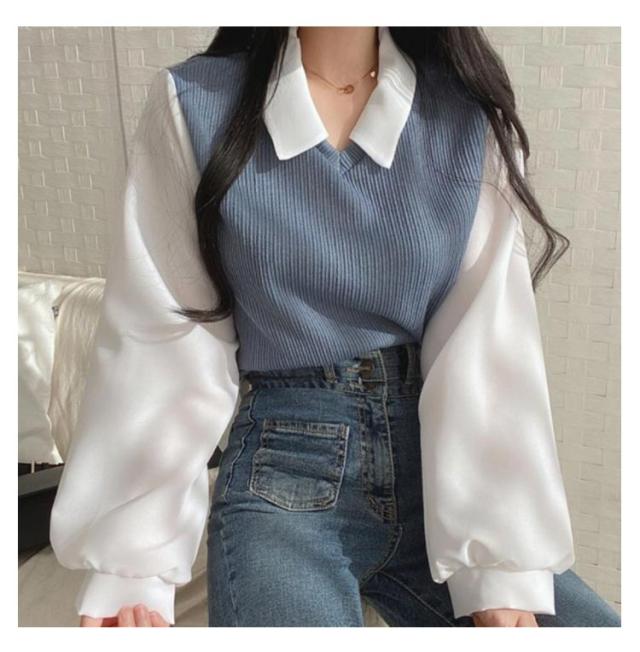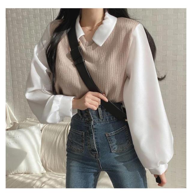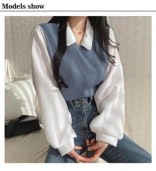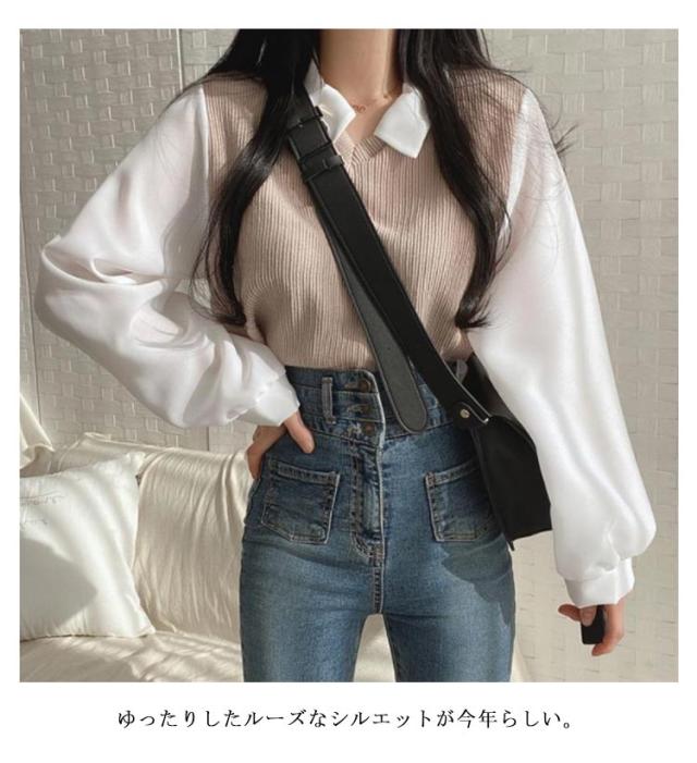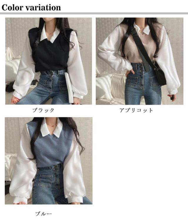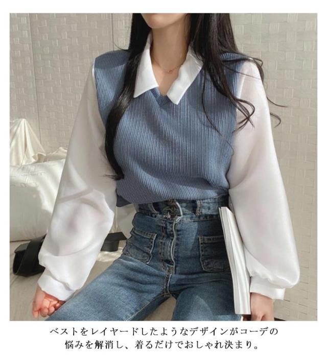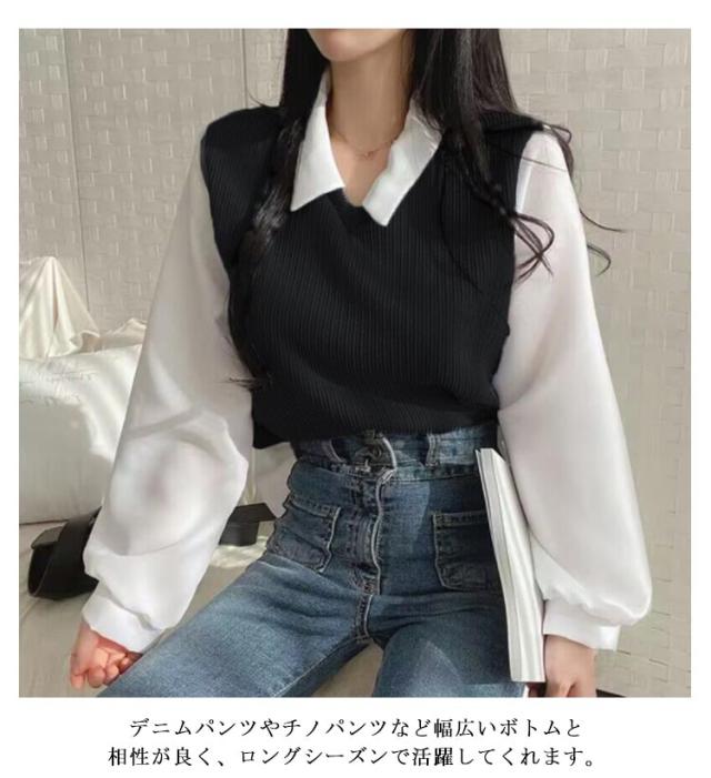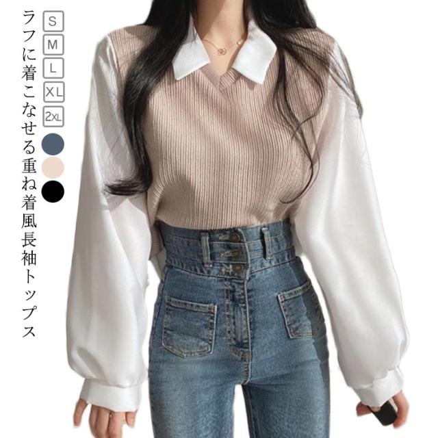 シャツ 重ね着風 プルオーバー レディース フェイクレイヤード シャツフェイク ブラウス トップス 可愛い カットソー トップス 長袖 無地 体型カバー シンプル 通勤 通学 春秋 大人 女性 ニット シャツ