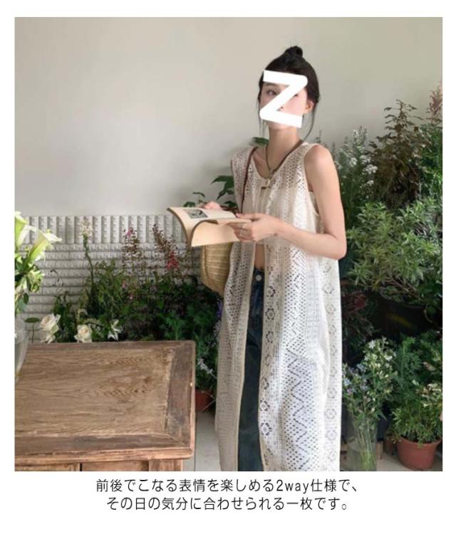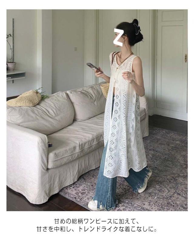 レディース レイヤード ロングジレ 2WAY 羽織り ワンピース ロングワンピース ノースリーブ 柄ワンピースに重ね着 ベスト ロング丈 ワンピース 花レース レイヤード ベストワンピース
