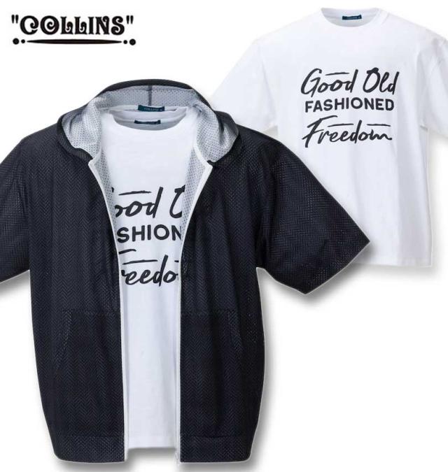 大きいサイズ COLLINS メッシュ ヘリンボーン風プリント 半袖フルジップパーカー+半袖Tシャツ ブラック系×ホワイト 3L 4L 5L 6L 8L/1258-4245-2-69