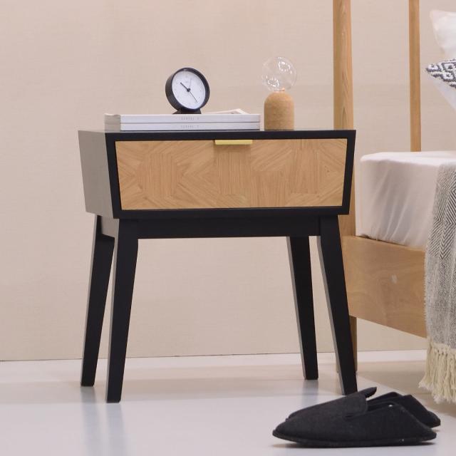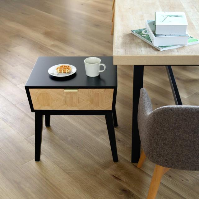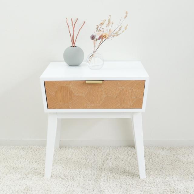 置くだけで気分も上がるお洒落なデザインの引き出し付きサイドテーブルです。逆台形の本体部分と、ハの字脚が組み合わさってスタイリッシュな印象です。限られたスペースにもすっきりとレイアウトすることができます。