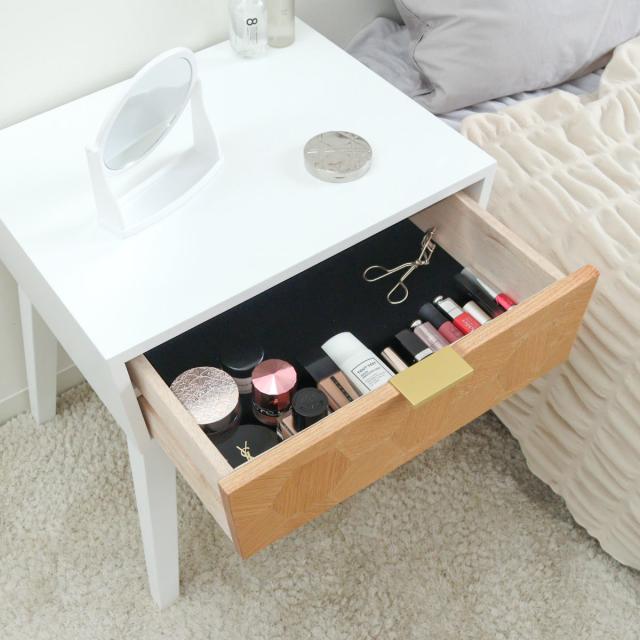 引き出しの内寸は約幅39×奥行30×高さ8.5cmあるので、コンパクトながらもたっぷりと収納することが出来ます。化粧品やメガネ、リモコンやA4サイズの本などの収納に便利です。