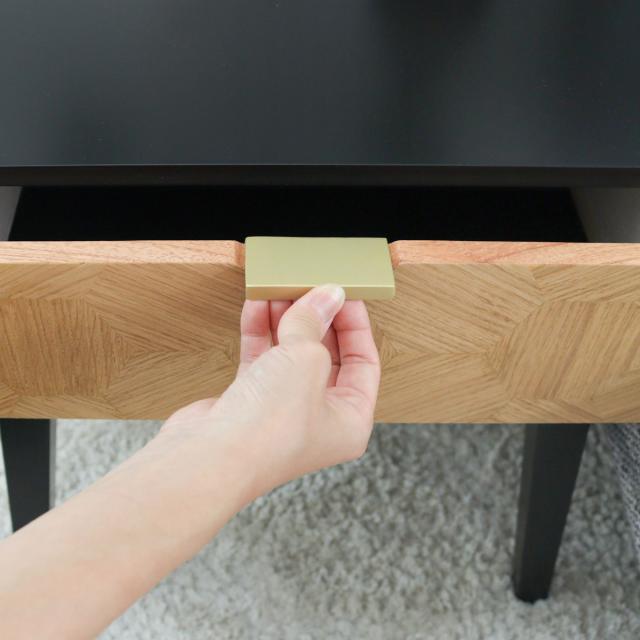 自然な木目に上品に映える取っ手が、全体のデザインを引き締めるアクセントになっています。取っ手が付いていることで、引き出しをスムーズに開け閉めできます。