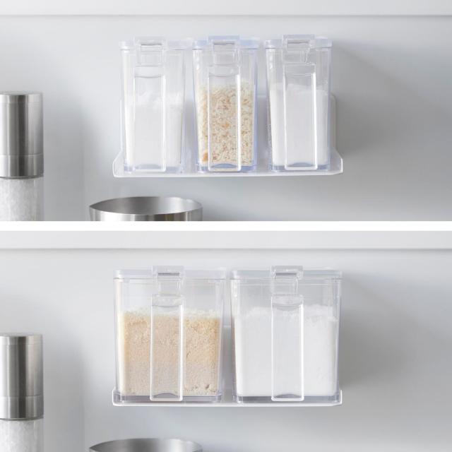 一般的なサイズの調味料ストッカーを2つ並べられる、調味料ストッカーラックです。フィルムフックで簡単に取り付けできます。キッチンパネルや壁面、冷蔵庫などに付けておけば、必要なときにサッと手に取れます。