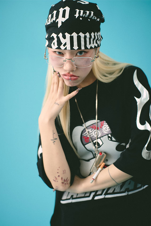 フロントにバンダナを巻いたチーマー風ワンちゃんを大胆にオンしたインパクト抜群のラグランTシャツ。