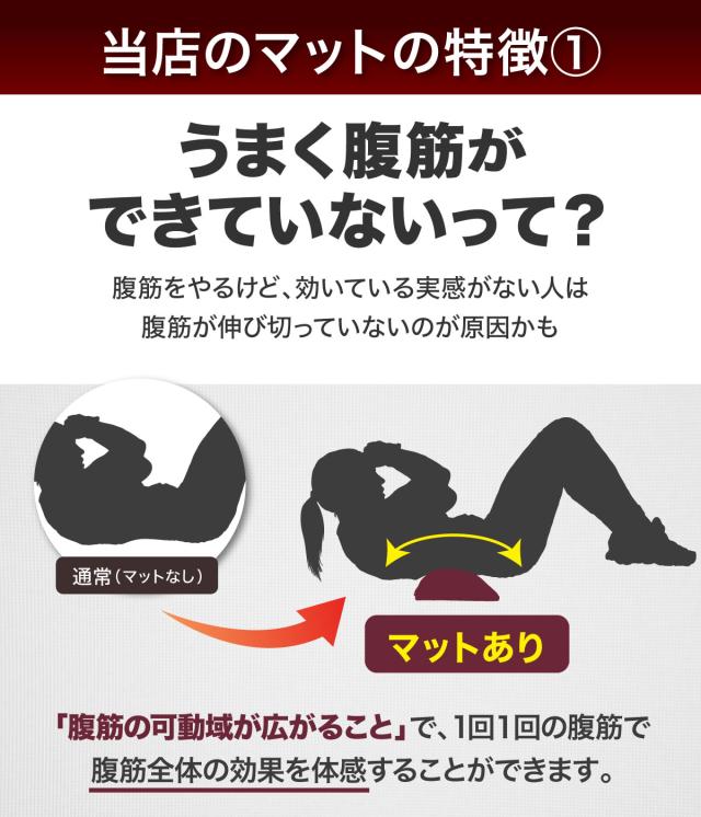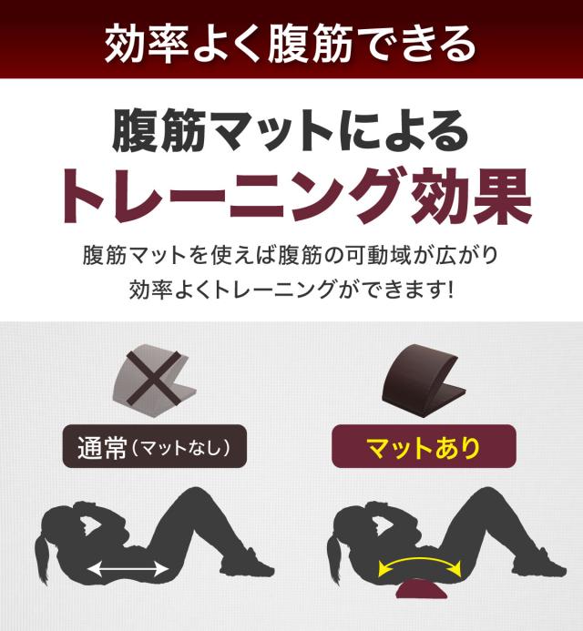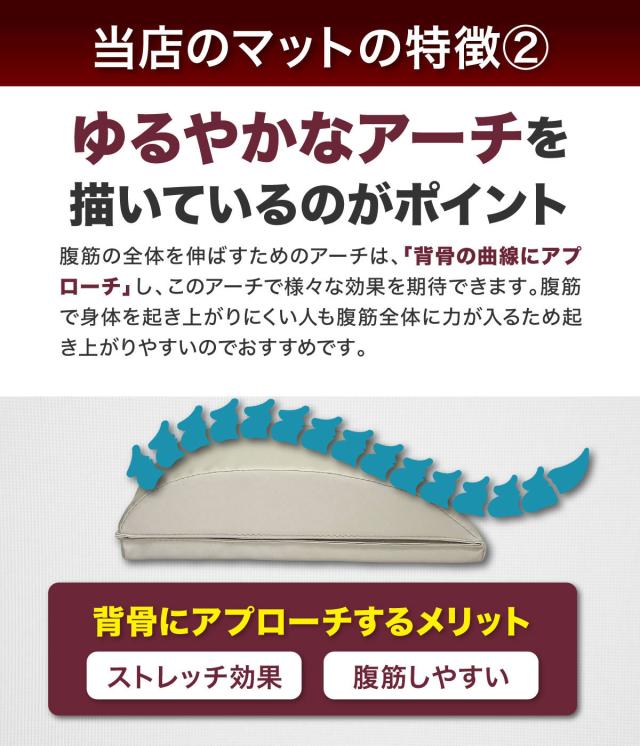 【ゆるやかなアーチで可動域が広がる】従来の腹筋だと、腹筋が伸び切らず可動域が狭くなってしまい上手く筋肉を使えていないことがあります。腹筋マットを使えば背骨の曲線に沿って腹筋が伸びるので、一回一回の腹筋で腹筋全体が使われるのを感じられ、効率的にトレーニングすることができます。