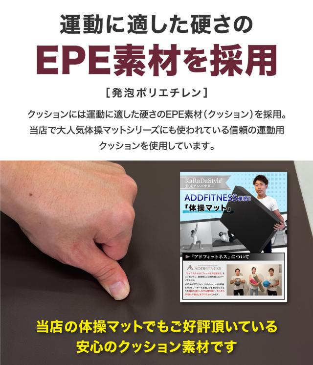 【運動に適した硬さのEPE素材】当店の大人気体操マットシリーズにも使われている、運動に適したEPE素材を採用。柔らかすぎず、硬すぎず、程よくサポートします。また生地には防水生地のPVCレザーを採用。汚れてもサッと拭くだけでキレイになります。