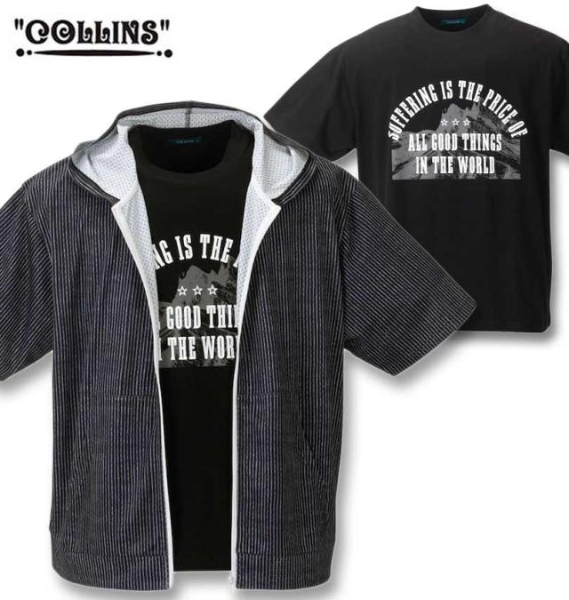 大きいサイズ COLLINS メッシュ ヒッコリー風プリント 半袖フルジップパーカー+半袖Tシャツ ブラック×ブラック 3L 4L 5L 6L 8L/1258-4244-2-69