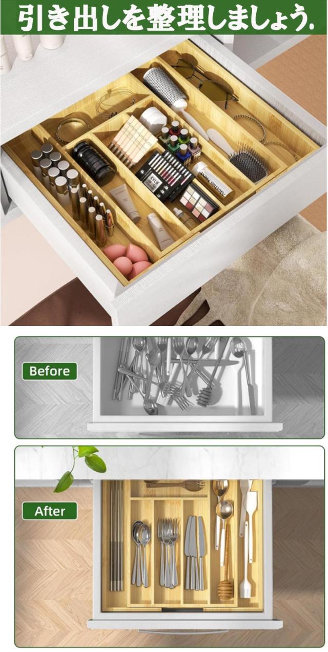 引き出しに整理整頓をもたらすだけでなく、洗練された持続可能な竹のデザインで上品さと優雅さを加えます。 整理されていない引き出しに別れを告げ、よりスタイリッシュで機能的な家へようこそ
