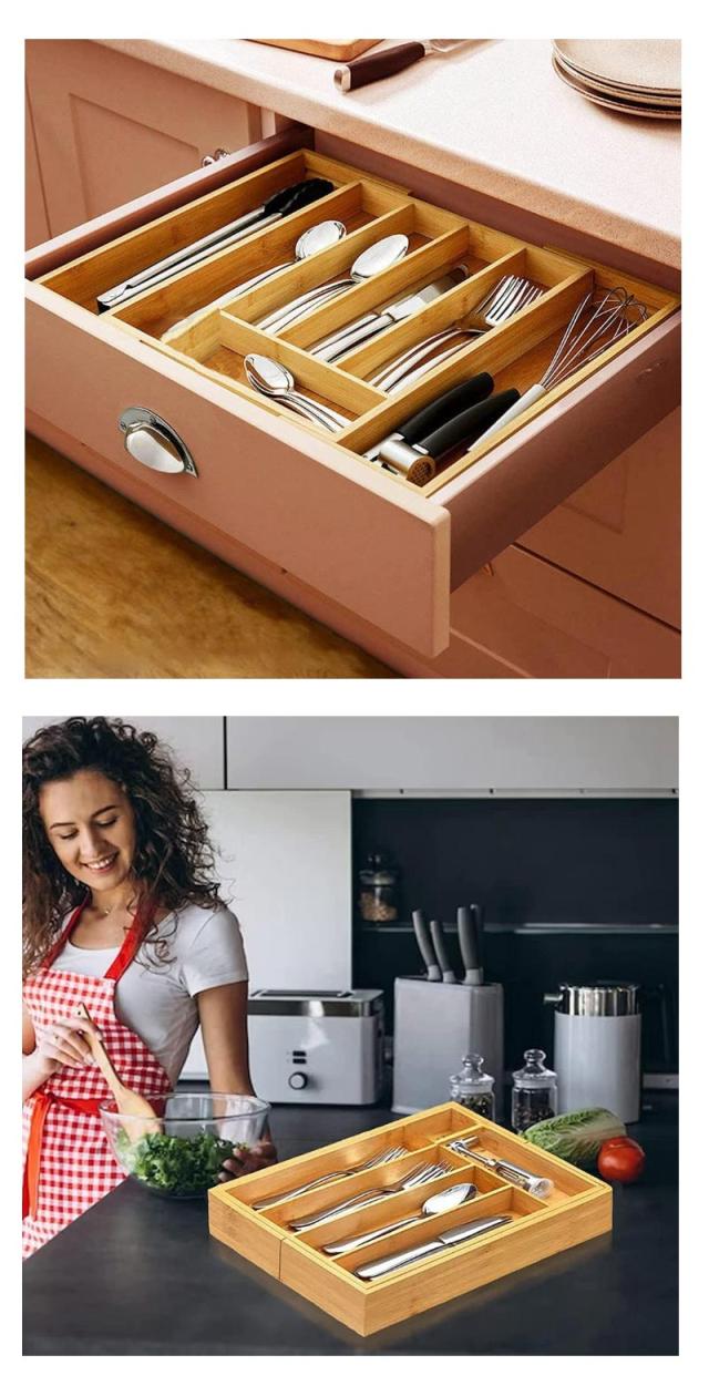 持続可能に収穫された竹から作られ、美しい温かみのある色調との竹の木目が特徴のこの竹製引き出しオーガナイザーは、ナイフホルダー付きで、ひび割れにくく、丈夫で長持ちし、安全に使用できます。
