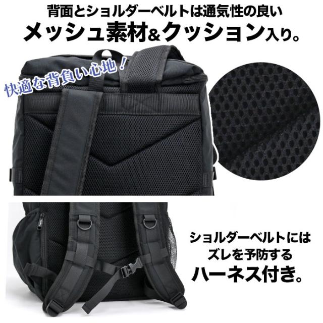 背面とショルダーベルトは通気性の良いメッシュ素材&クッション入りで快適な背負い心地。ショルダーベルトにはズレを予防するハーネス付きです。