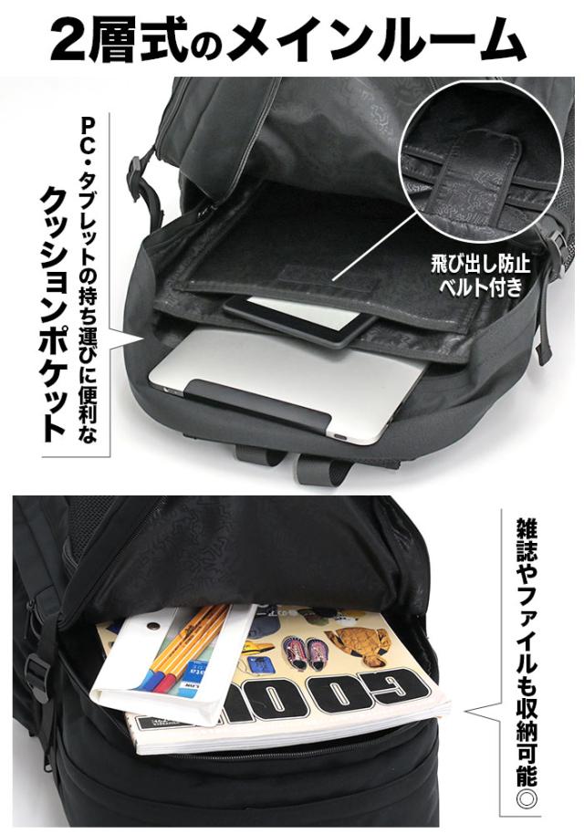 内側にはノートパソコンやタブレットの持ち運びにピッタリのクッションポケットを搭載。