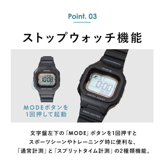 | 商品説明 | 【冒険心をくすぐるデザイン】 ・スタイリッシュなデザインがボーイズの腕で光る「MAGソーラーウォッチ ウェーブフォース」。 【コンパクトなケースサイズ】 ・柔らかな丸みのあるフォルムと小ぶりなサイズで、キッズや女性の腕にもすんなりフィット! 【シンプルで見やすい液晶ウィンドウ】 ・秒数までパッと読み取れるデジタル時計に、カレンダー・曜日機能を搭載したシンプルデザイン。 【正確な時刻を知らせる電波時計】 ・標準電波を受信して時刻を自動で修正してくれる電波式だから、面倒な時刻合わせの手間が軽減。 【ソーラーパワー×リチウム電池】 ・日光や照明の光で電池の消費が抑えられる「ソーラー×リチウム電池」のデュアルパワー駆動式。 ・※CR2032型ボタン型電池1個使用。お試し用電池が内蔵されています。 【機能切り替えスイッチで簡単操作】 ・文字盤外側の「LIGHT」「MODE」「START」「RESET」の4つボタンで様々な機能を簡単操作! 【ストップウォッチ機能】 ・スポーツシーンやトレーニングに便利な2種類のストップウォッチ機能を搭載! ・※通常時刻表示で「MODE」ボタンを押して起動。「通常計測」と「スプリットタイム計測」の2種類の使い分けが可能。 【アラーム機能&報時機能】 ・会議中の経過時間の管理などに活躍!アクティブパーソンに嬉しい「アラーム・報時機能」付き。 ・※通常時刻表示で「MODE」ボタンを2回押して起動。「START」ボタンで「アラーム」「報時機能」を切り替え可能。 【10気圧防水機能】 ・手を洗う時や、屋外で突然にわか雨に降られても安心な「生活防水仕様」(10気圧防水)。 【バックライト機能付き】 ・文字盤左上の「LIGHT」ボタンを押すとELバッグライトが点灯。暗い場所やアウトドアで便利! 【12/24時間表示切替機能】 ・キッズからビジネスパーソンまで、時計を使う人に合わせて見やすくカスタマイズ。 【ユニセックスデザイン】 ・性別や世代を問わずに着用できるスポーティーなルックスとシックなカラーも魅力のひとつ。 |