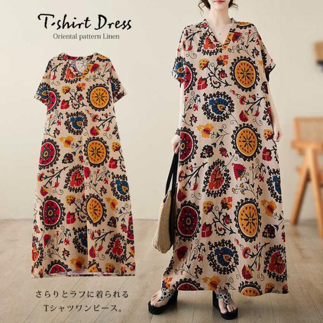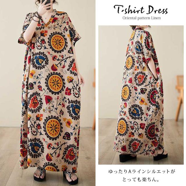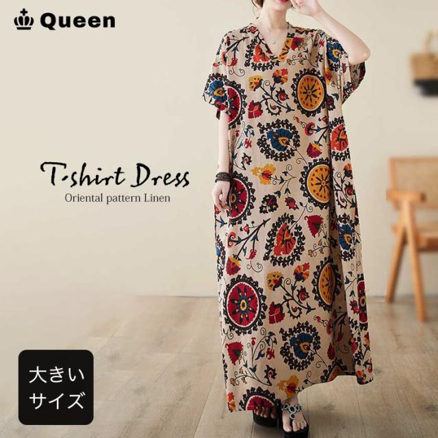 ★☆大きいサイズ レディース 柄ワンピース マキシワンピ 半袖ワンピ Vネック オリエンタル柄 夏 LL 3L 4L 5L 6L ベージュ☆★
