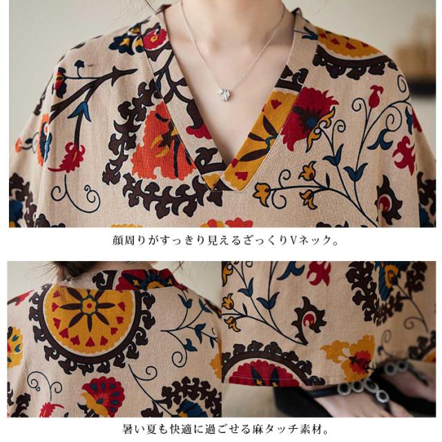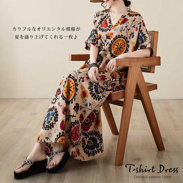 大きいサイズ レディース 柄ワンピース マキシワンピ 半袖ワンピ Vネック オリエンタル柄 夏 (79013)