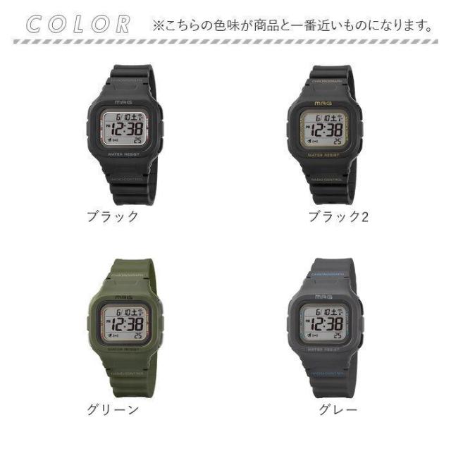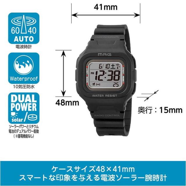 【冒険心をくすぐるデザイン】スタイリッシュなデザインがボーイズの腕で光る「MAGソーラーウォッチ ウェーブフォース」。【コンパクトなケースサイズ】柔らかな丸みのあるフォルムと小ぶりなサイズで、キッズや女性の腕にもすんなりフィット!【シンプルで見やすい液晶ウィンドウ】秒数までパッと読み取れるデジタル時計に、カレンダー・曜日機能を搭載したシンプルデザイン。【正確な時刻を知らせる電波時計】標準電波を受信して時刻を自動で修正してくれる電波式だから、面倒な時刻合わせの手間が軽減。【ソーラーパワー×リチウム電池】日光や照明の光で電池の消費が抑えられる「ソーラー×リチウム電池」のデュアルパワー駆動式。※CR2032型ボタン型電池1個使用。お試し用電池が内蔵されています。【機能切り替えスイッチで簡単操作】文字盤外側の「LIGHT」「MODE」「START」「RESET」の4つボタンで様々な機能を簡単操作!【ストップウォッチ機能】スポーツシーンやトレーニングに便利な2種類のストップウォッチ機能を搭載!※通常時刻表示で「MODE」ボタンを押して起動。「通常計測」と「スプリットタイム計測」の2種類の使い分けが可能。【アラーム機能&報時機能】会議中の経過時間の管理などに活躍!アクティブパーソンに嬉しい「アラーム・報時機能」付き。※通常時刻表示で「MODE」ボタンを2回押して起動。「START」ボタンで「アラーム」「報時機能」を切り替え可能。【10気圧防水機能】手を洗う時や、屋外で突然にわか雨に降られても安心な「生活防水仕様」(10気圧防水)。【バックライト機能付き】文字盤左上の「LIGHT」ボタンを押すとELバッグライトが点灯。暗い場所やアウトドアで便利!【12/24時間表示切替機能】キッズからビジネスパーソンまで、時計を使う人に合わせて見やすくカスタマイズ。【ユニセックスデザイン】性別や世代を問わずに着用できるスポーティーなルックスとシックなカラーも魅力のひとつ。