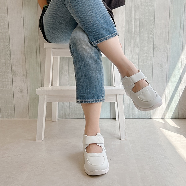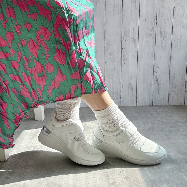 シンプルストラップスニーカーにエレガンスの要素をプラスして、カジュアル過ぎない大人スニーカーが完成