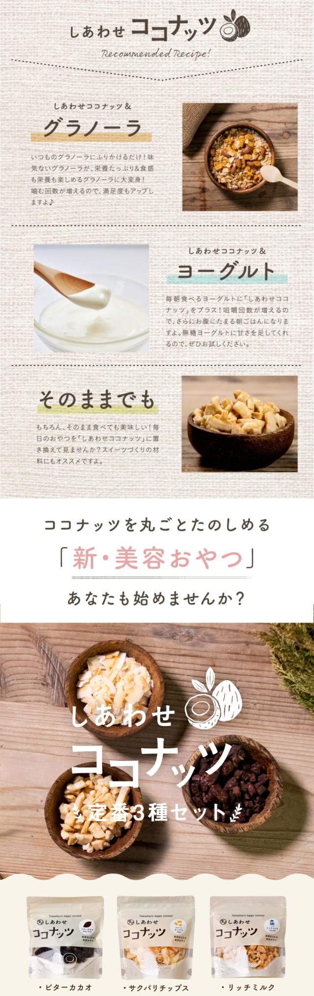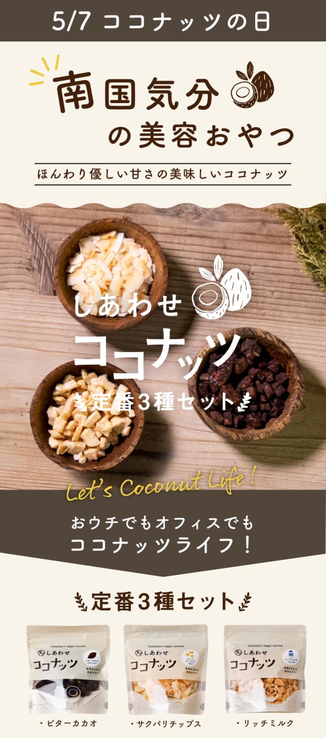 \気分は南国気分♪/しあわせココナッツ定番3種セット(カカオ・サクパリ・リッチミルク) サクサク カリカリ 優しい香り 甘さ 美味しい ココナッツ タマチャンショップ 南国フルーツ お試し 食品 おつまみ おやつ ギフト プレゼント スイーツ おやつ 送料無料