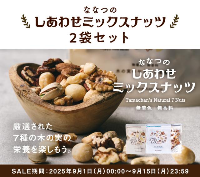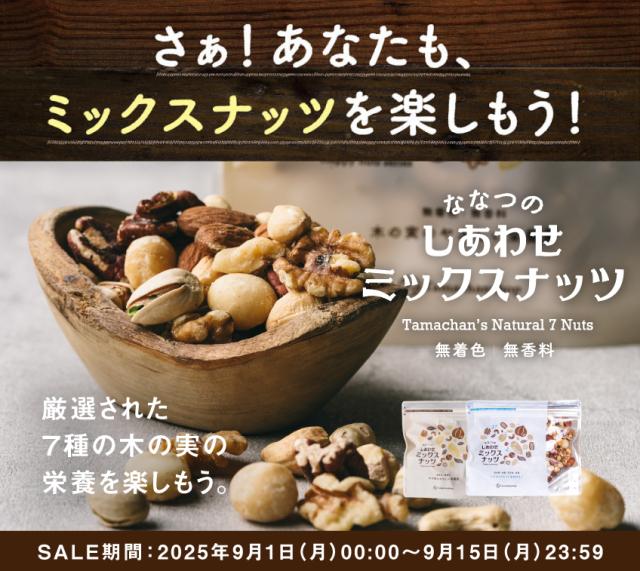 7種類の人気ナッツを1袋で楽しめる、タマチャン品質のこだわりミックスナッツ。産地と品質を厳選し、季節に合わせて独自にローストを変えるタマチャンだけのオリジナル製法。本当に美味しいナッツを求める方へ、しあわせを届けるミックスナッツ。