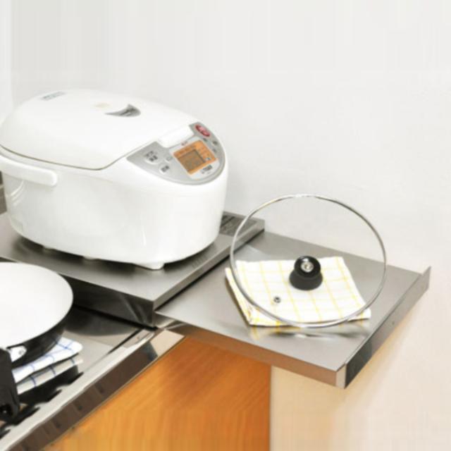 炊飯器などの家電下において、必要な時にさっと引き出してちょい置きスペースが作れるスライドテーブルです。調理途中のボウルやおたまなどの一時置き場、ごはんの盛り付け台など、ちょい置きにぴったりです。作業台を置くスペースを増やしたいと考えている方におすすめのアイテムです。