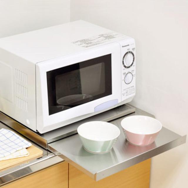 電子レンジなどの家電下において、必要な時にさっと引き出してちょい置きスペースが作れるスライドテーブルです。調理途中のボウルやおたまなどの一時置き場、ごはんの盛り付け台など、ちょい置きにぴったりです。作業台を置くスペースを増やしたいと考えている方におすすめのアイテムです。