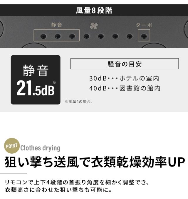 左右首振り角度(60°/90°/120°)・上下首振り幅(上/中/下)を調整でき、衣類の狙い撃ちも可能に。