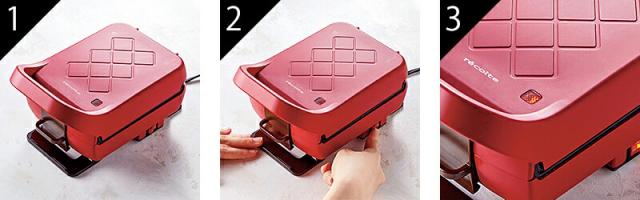 | 1. 平らな場所に本体を置き、カバーを完全に下まで閉じてください 2. 電源プラグをコンセントに差し込み、電源スイッチの「-」を押してください 3. 電源が入ると同時に、予熱を開始(カバー上のランプが点灯します)。ランプが消えたら予熱完了です |
