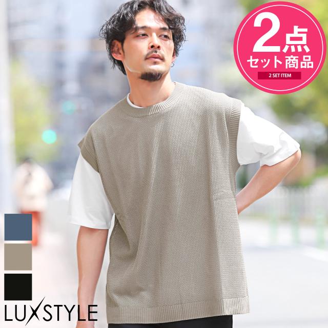 Tシャツ 半袖 ニットベスト メンズ アンサンブル 2点セット 無地 春 夏 レイヤード【サマーニットベスト×半袖Tシャツセット】 aa-3083
