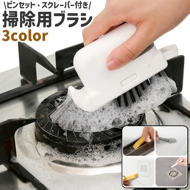 掃除用ブラシ 柄付きブラシ クリーニングブラシ ピンセット付き スクレーパー付き シンプル キッチン 台所 流し台 ガスコンロ