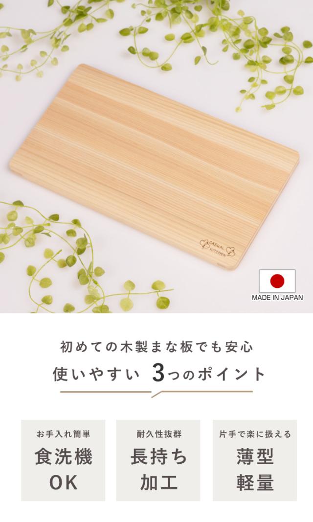 ヒノキは、軽くて、水に強く、よくまな板に使わる素材。本品は軽さにこだわり、食洗機で洗える加工が施されてるので、初めて木製まな板を使う方にオススメな1枚です。