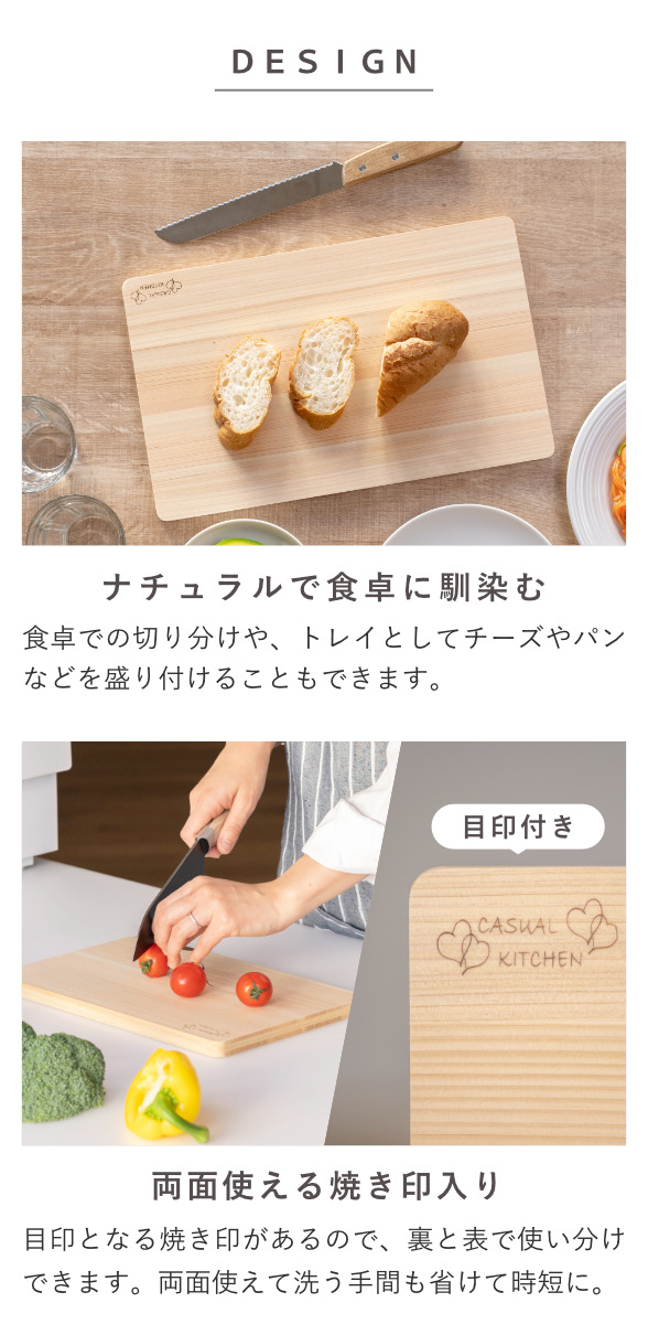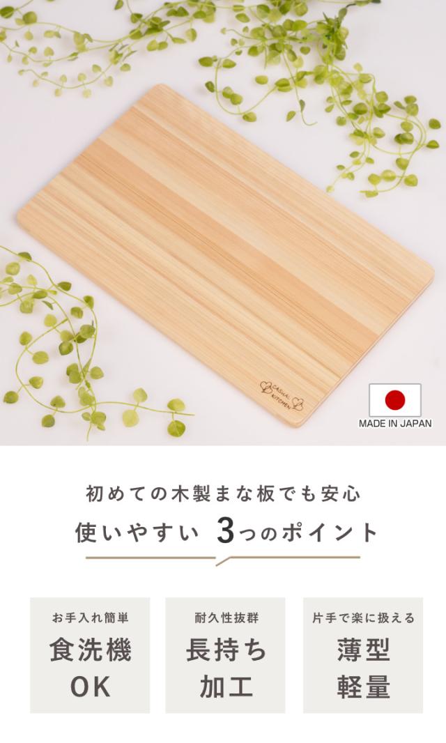 ヒノキは、軽くて、水に強く、よくまな板に使わる素材。本品は軽さにこだわり、食洗機で洗える加工が施されてるので、初めて木製まな板を使う方にオススメな1枚です。