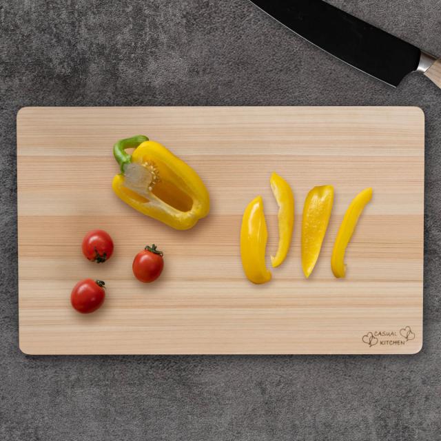 ヒノキは、軽くて、水に強く、よくまな板に使わる素材。本品は軽さにこだわり、食洗機で洗える加工が施されてるので、初めて木製まな板を使う方にオススメな1枚です。