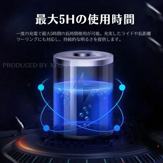 一度の充電で最大5時間の長時間使用が可能。充実したライドや長距離ツーリングにも対応し、持続的な明るさを提供します。