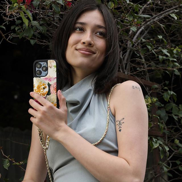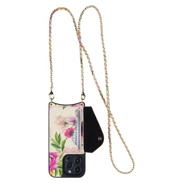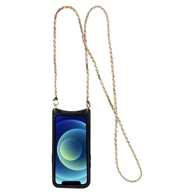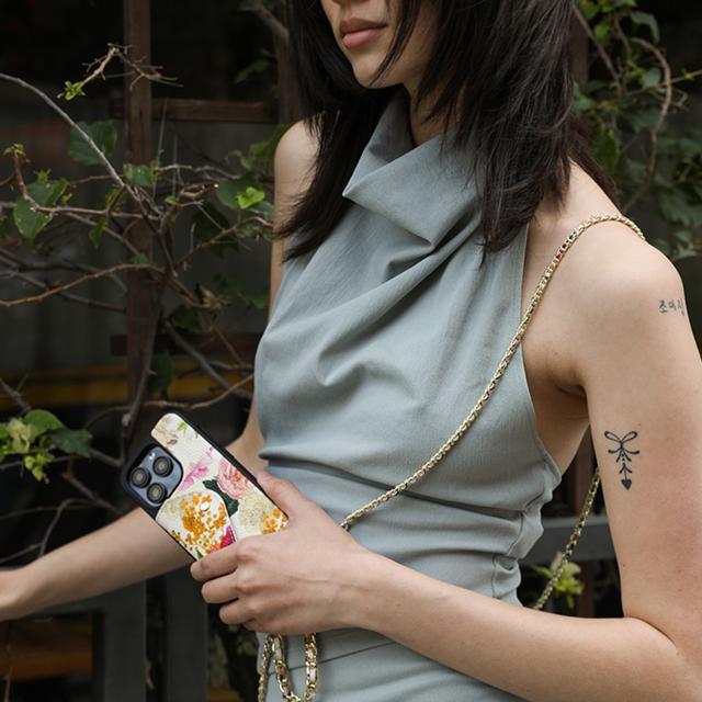 BANDOLIERのiPhoneシリーズ対応スマートフォンケースです。ゴールドのチェーンで編まれたストラップスタイルで、女性らしい華やかな印象のフラワーデザインに、繊細なゴールドチェーンのストラップが付いたスタイル。その日のスタイルに合わせてストラップの付け替えができます。