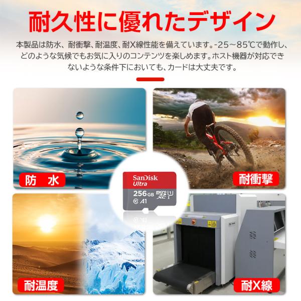 サンディスク ウルトラ microSD UHS-Iカードは、耐衝撃性、温度耐性、防水、X線耐性に優れているため、メモリーカードの耐久性を気にせずにアドベンチャーを楽しめます。