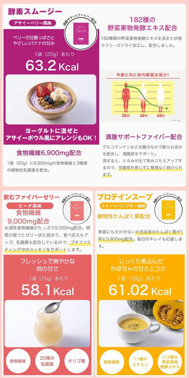 水溶性食物繊維(アメリカ製造)、果糖、砂糖、ぶどう糖、アサイーエキスパウダー、バナナパウダー、脱脂粉乳、野菜ミックスパウダー、グルコマンナン、りんご果汁パウダー、ぶどう果汁パウダー、レモン果汁パウダー、穀物発酵エキス末、植物発酵エキス末、植物発酵物乾燥粉末、パン酵母粉末(ぶどう糖、マンガン含有酵母、亜鉛含有酵母、銅含有酵母、モリブデン含有酵母、ヨウ素含有酵母、セレン含有酵母、クロム含有酵母)、野草発酵エキス粉末/酸味料、増粘多糖類、カラメル色素、甘味料(ステビア)、野菜色素、V.C、香料、抽出V.E、ナイアシン、パントテン酸Ca、V.B1、V.B6、V.B2、V.A、葉酸、V.D、V.B12、(一部に大豆・乳成分・バナナ・やまいも・りんご・オレンジ・カシューナッツ・キウイフルーツ・ゴマ・小麦を含む)