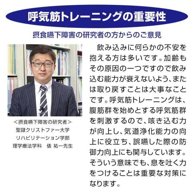 呼気筋トレーニングは、腹筋群を始めとする呼気筋群を刺激するので、咳き込む力が向上し