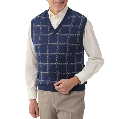 ニットベスト チョッキ ベージュ ネイビー チェック Vネック V首 メンズ 日本製 綿混 格子柄Vベスト 全2色 紳士服 シニア 男性 薄茶色 紺 シンプル 洗濯機 洗える シニアファッション 40代 50代 60代 70代 80代 父の日 お父さん おじいちゃん 春夏 コーデ sai p25667