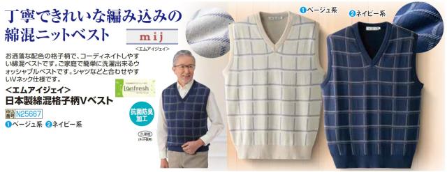日本製 綿混格子柄Vベスト 全2色 ニットベスト チョッキ ベージュ ネイビー チェック V首 メンズ 紳士服 シニア 男性 薄茶色 紺色 シンプル 洗濯機 洗える シニアファッション 40代 50代 60代 70代 80代 父の日 お父さん 春夏