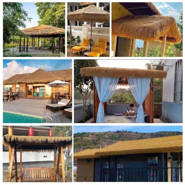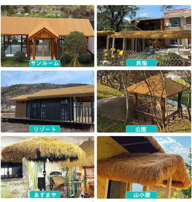 【難燃性茅葺きルーフロール】:合成茅葺きは通常、難燃性素材で作られており、発火しにくく、炎の広がりを遅らせます。 天然茅葺き屋根に比べて火災のリスクが大幅に軽減されるため、住宅所有者に安心感を与えます。