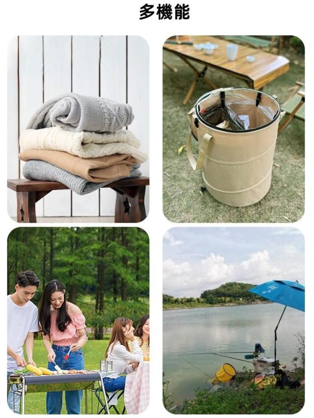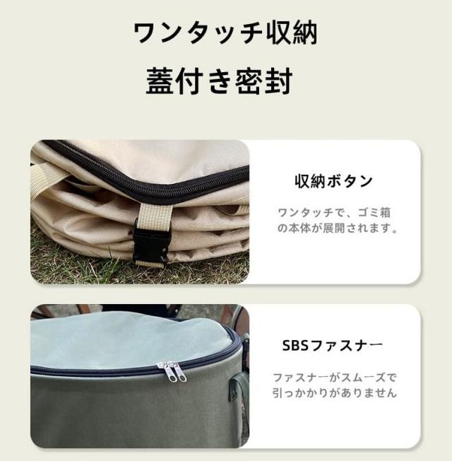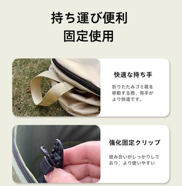 【様々なシーンに適用】15kgの耐荷重になります。折りたたんだ時は上下のバックルでコンパクトに収納、場所取らないのも魅力的です、使う時は自立して使いやすいゴミ箱です。キャンプゴミ箱以外でも薪入れや、ストーブを持ち運ぶケースとして、落葉の清掃作業をする時に使用、車載の際の収納ボックス、キャンプ用品の運搬にも使用出来ます