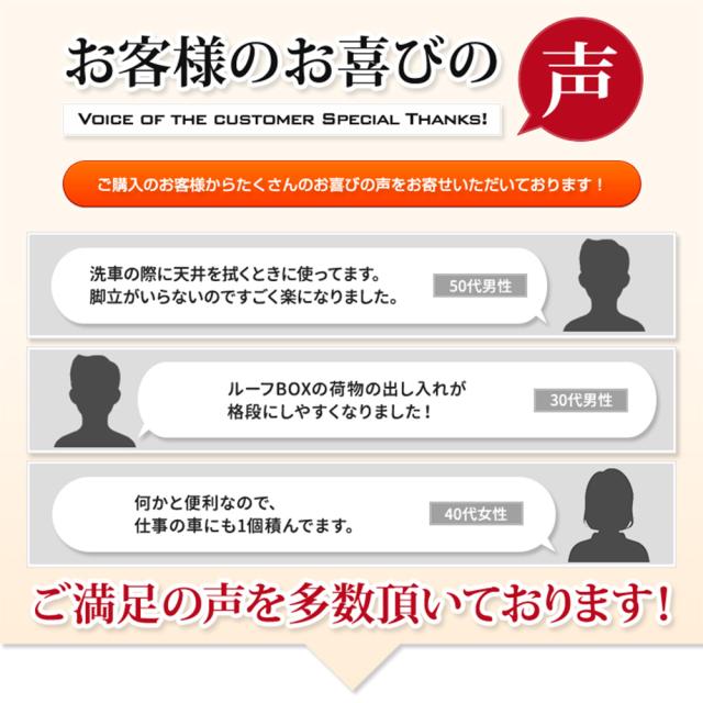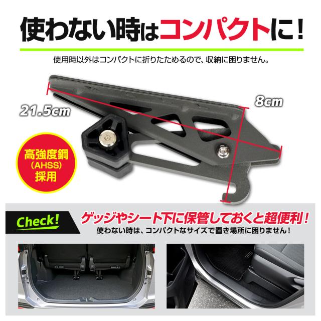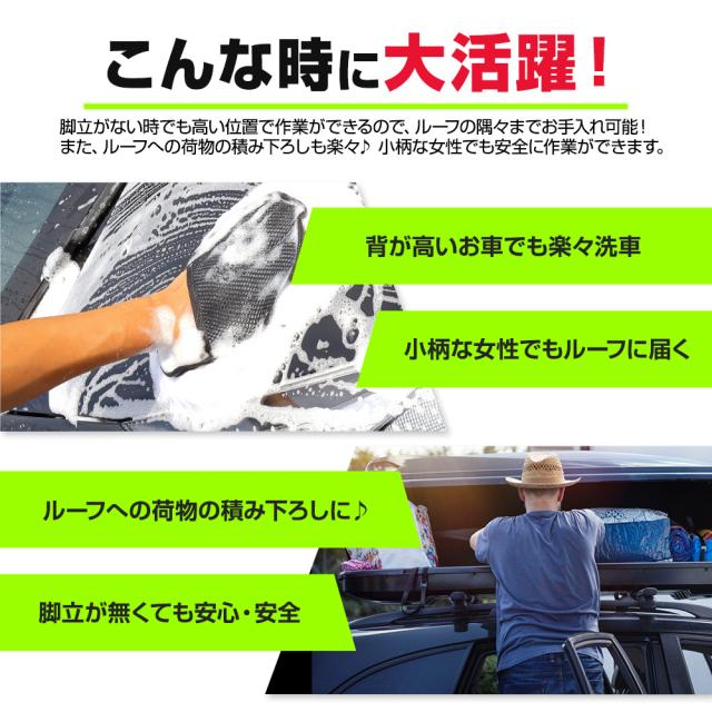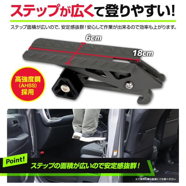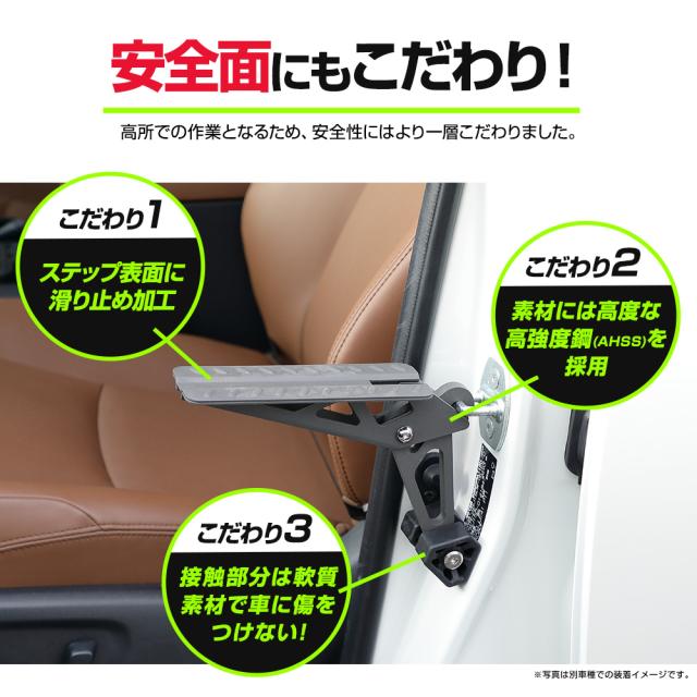 簡単取り付けで、ルーフへの荷物の積みおろしや洗車に便利なドアステップ。 他社商品に比べて高い位置に設置可能。さらに便利に大活躍! これさえあれば脚立はもう必要ありません。 工具不要の簡単設置!ドアストライカーにひっかけるだけ! どなたでも簡単にお気軽に使用可能です。 ステップ面積が広く、安定感抜群!より快適にルーフ周りの作業を行うことができます。 また、ステップの表面には滑り止め加工が施し安全性を高めています。 素材には高強度鋼(AHSS)を採用しており、強度・剛性もバッチリ! 耐荷重量は180kgで、使用される方の身体をしっかりと支えます。 さらに、車体に接触する箇所には軟質素材を採用しているので、大切なお車を傷付けることはありません。 使用時以外はコンパクトに折りたためるので、邪魔にならず車内に保管可能です。 ラゲッジスペースやシート下に常備しておくとルーフ周りの作業に大変便利です。 |