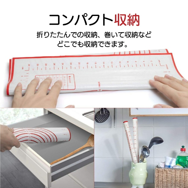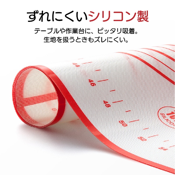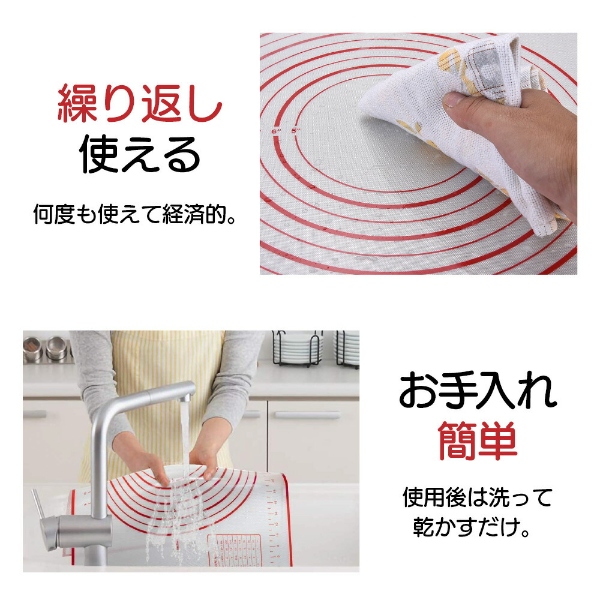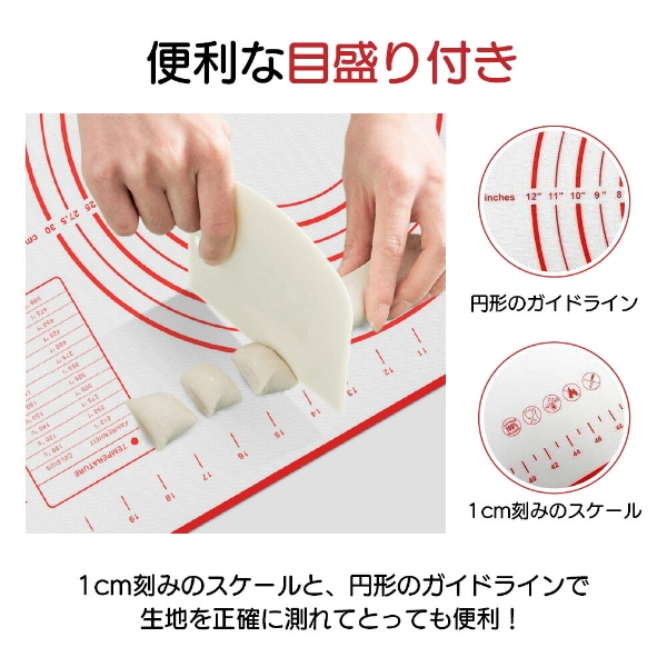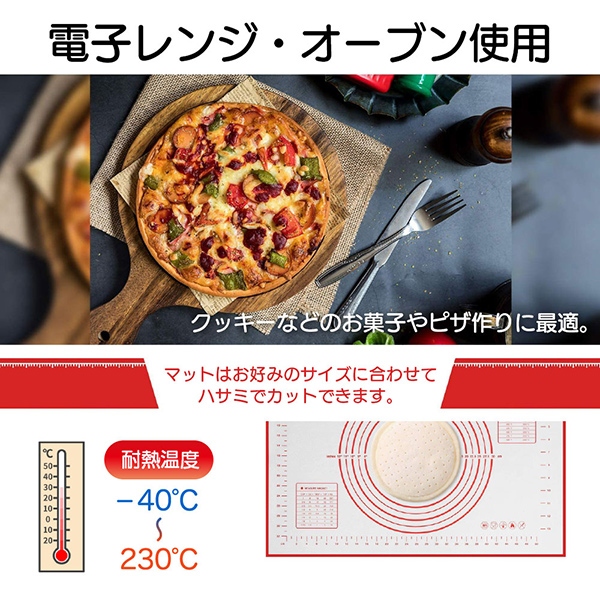 【キッチンの可能性を広げ、お菓子作りをもっと楽しく!】 シリコン製ベーキングマットは、パン作りやお菓子作りに欠かせない万能アイテムです。 滑らかなシリコン素材は、生地がくっつきにくいので、パン、ケーキ、クッキー、マフィンなど、あらゆるベーキングプロジェクトに最適です。 【購入されたお客様からのレビュー(一部)を抜粋♪】 30代 女性 購入者様 パン作りにハマって買ってみました。 すべらなくて大きさもちょうどよく、 パンが作りやすいです。 メモリが書いてあるのもうれしい。 まな板で十分かなと思っていましたが、 やはりあったほうがよかったです。 早く買えばよかった! 40代 女性 購入者様 レビューの評価良かったので購入しました。 最近パン作りを始め、 形から入るので全て揃えてみました。 評価通り、非常に使いやすいです。 ピタリとくっついて、 パン生地がこねやすかったです。 40代 女性 購入者様 良い商品です 元パン屋なのですが、 パン屋で働いていた頃のように力いっぱい捏ねたいと思って購入しました。 キッチンに敷いてもズレないし、クル クル巻いて収納できるしでとても気に入りました。 60代 女性 購入者様 初めてパン生地をこねる時に使用してみました。 今までは、プラスチック製の物を使用していたのでこねる時にはマットが動いてなかなか 上手くこねる事が出来なかったのですか、このマ ットはしっかり密着して優れものでした。 これからストレスなくパン作りが楽しめそうです。 購入者 様 パンこねと、 クッキー形成用に購入! オーブンシートとして使用したところ、180°C、 焼き菓子系は余裕ですね! あとは、 パン類の200°C前後に耐えられるかです。今まで使使用してきたものより安いのに丈夫そうなので、 200°C前後への耐熱と使い勝手でリピしたい! 40代 女性 購入者様 ずれなくてとてもいい 購入してよかったです! 今までマットレスがずれてマットレスを抑えながら パン生地をこねてましたが、これならずれずに使えてすごくいいです。 生地を伸ばすスケールも付いていてとても便利です。 【多様な用途を可能にするサイズ】 60cm×40cm の大きめサイズは、オーブンシートよりも広く、作業スペースを確保できます。 また、目盛り付きデザインなので、生地を正確なサイズにカットすることができ、失敗を防ぎます。 【安定した作業を実現する滑り止め機能】 オーブンシートやクッキングシートの代用品としても使用できます。 安定した滑り止め機能は、生地を捏ねたり、シルパンとして使用する際にもずれることなく、快適な作業を可能にします。 【簡単なお手入れでいつも清潔】 丸洗い可能なこのシリコンマットは、使用後のお手入れが極めて簡単です。 汚れが落ちやすく、速乾性にも優れているため、衛生的で何度も使えるエコフレンドリーな選択肢となります。 クッキー型やケーキ型、パン型などのベーキングツールと一緒に、衛生的な状態を維持しやすくします。 【色とデザインでキッチンを彩る】 レッドとブラックの2色展開なので、キッチンの雰囲気に合わせて選ぶことができます。 また、折りたたんで収納できるので、場所を取らずに保管できます。 【新しい料理のアイデアやインスピレーションを提供】 家庭料理愛好家や初心者から上級者までの製菓者に、新しい料理のアイデアやインスピレーションを提供します。 耐熱性があり、-40度から230度まで対応するこのマットは、オーブン対応ベーキングマットとしても、 安全なクッキングマットとしても、さまざまな料理シーンで活躍します。 【クッキングマットをはじめて用意する人も必見です】 シリコン製ベーキングマットは、パン作りやお菓子作りの作業をサポートし、 キッチンの持続可能な選択肢としても機能します。この一枚があれば、 お菓子作りやベーキングの過程をもっと手軽に、楽しみながら、効率的に進めることが可能になります。 シリコンベーキングマットを活用して、料理の新たな可能性を探求してみましょう。 【商品仕様】 【サイズ】60cm × 40cm 【耐熱温度】-40度〜230度 【カラー】レッド,ブラック 【商品特徴・キーワード】 シリコンベーキングマット 耐熱ベーキングマット パン作りアクセサリー お菓子作りツール キッチン用シリコンマット 丸洗い可能なベーキングマット オーブン対応ベーキングマット 滑らない調理マット 目盛り付きベーキングマット 省スペースキッチン用品 エコフレンドリー調理器具 クッキングシート代用品 クッキングマット パンマット パン作り ベーキングマット パンこね台 60cm×40cm シリコンマット 耐熱 ベーキングマット キッチン ブラック レッド シリコン ベーキングシート クッキングシート 電子レンジ オーブン パン作り こね台 キッチン オシャレ おしゃれ 送料無料 人気 プレゼント ギフト 贈り物 ハロウィン クリスマス 誕生日 父の日 母の日 【注意事項】 ※本商品には説明書が付属しておりません。使用方法に関しては