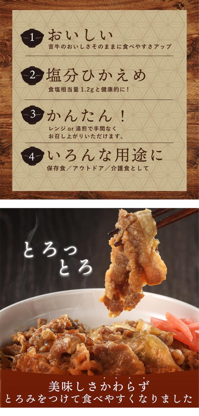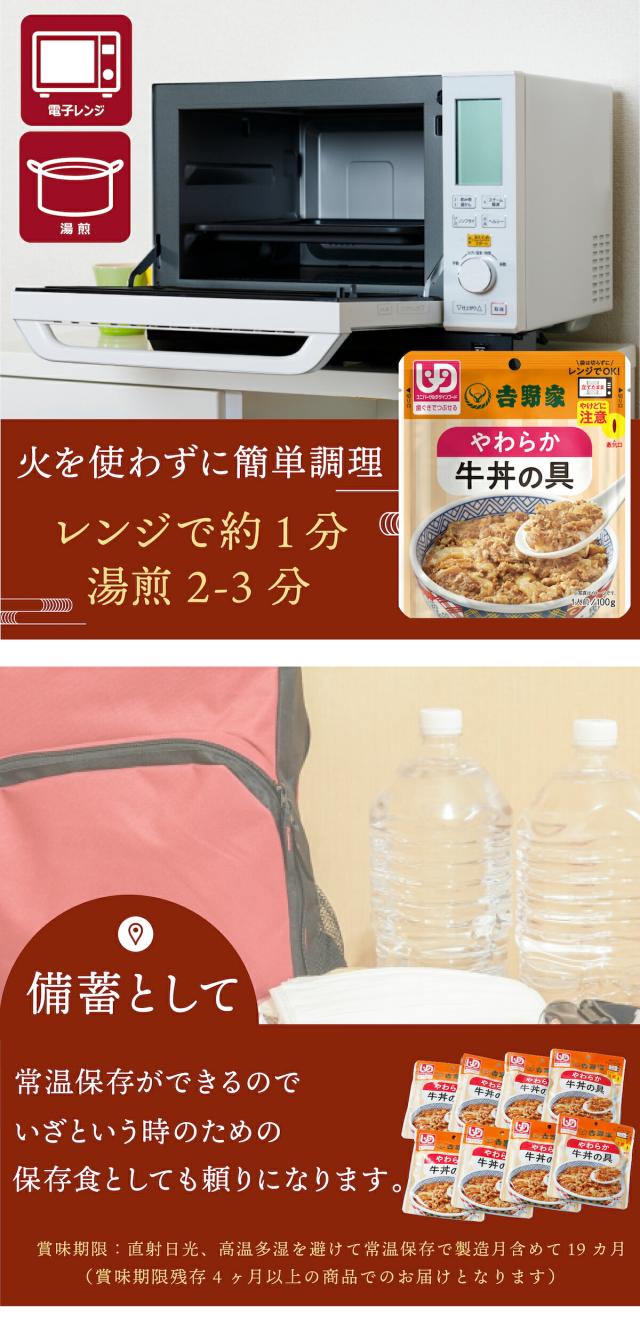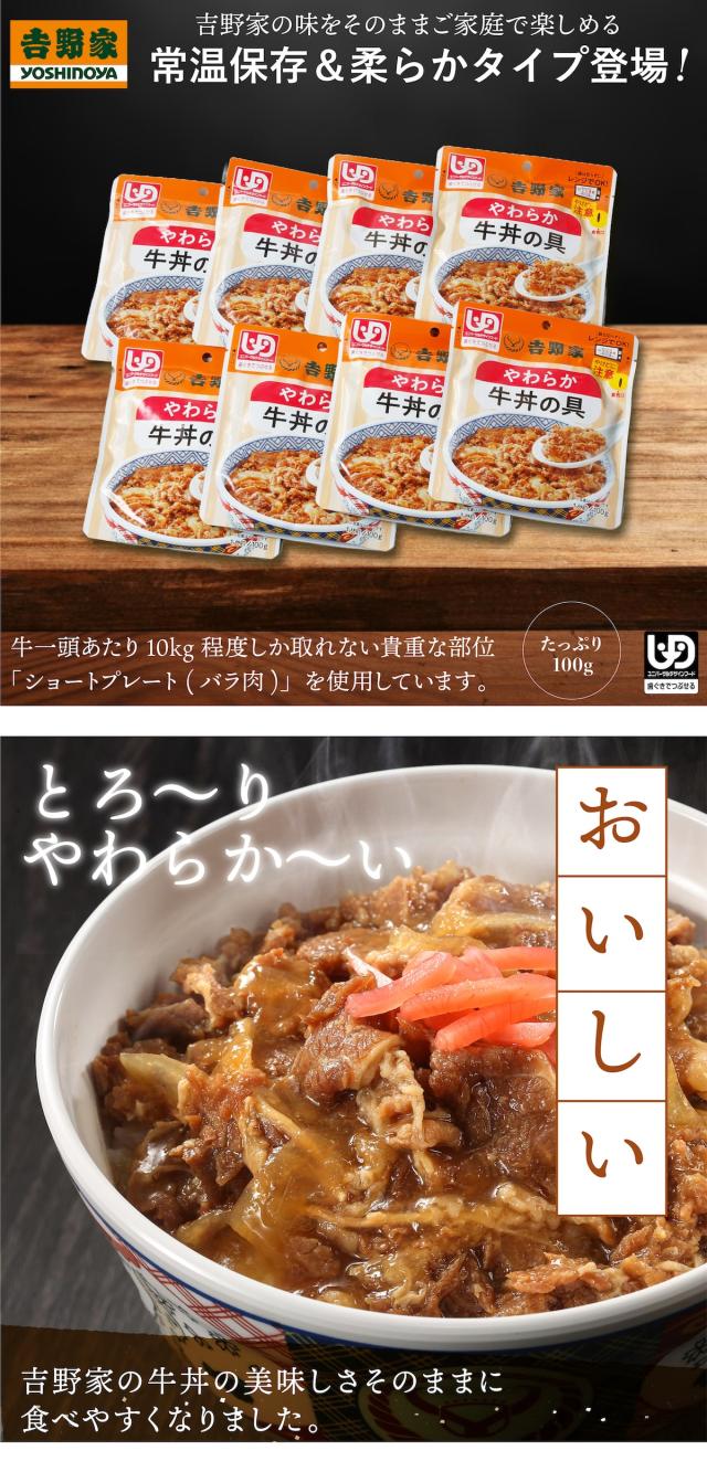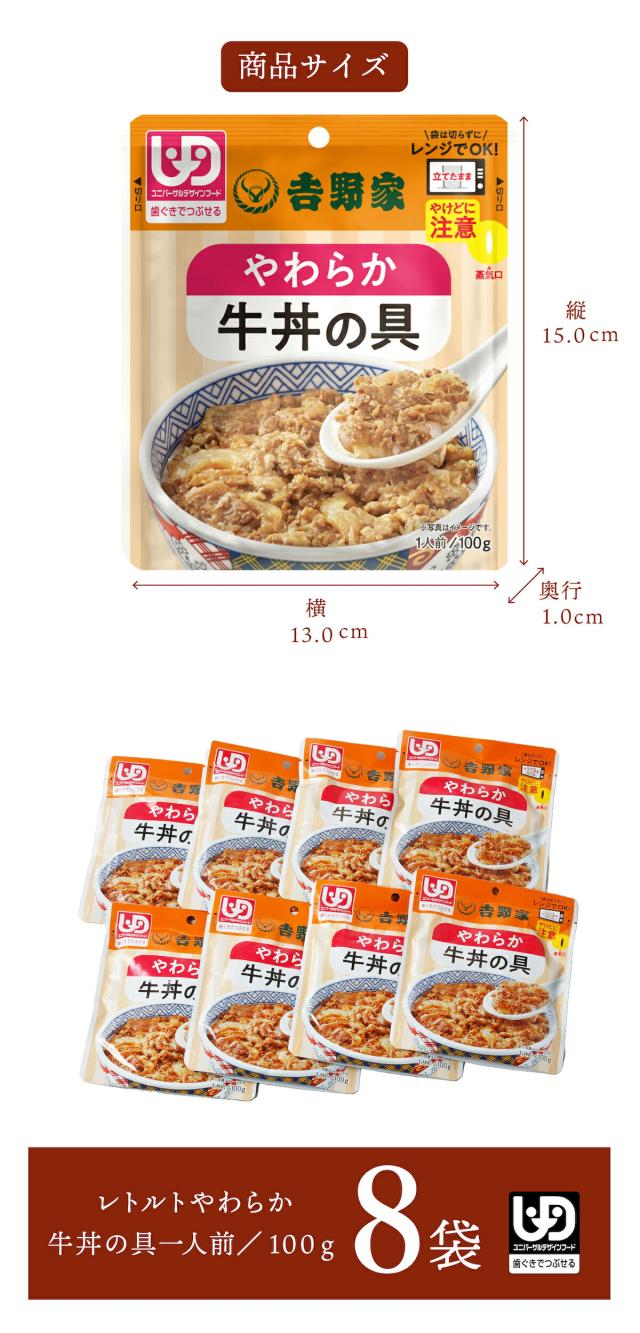 吉野家 常温レトルトやわらか牛丼の具 100g 8袋 介護用食品 減塩 レトルト やわらかい 歯ぐきでつぶせる ユニバーサルデザインフード UDF 常備品 ストック 簡単調理 レンジ調理 湯煎対応 介護食 通販 高齢者 子供 ギフト 贈り物