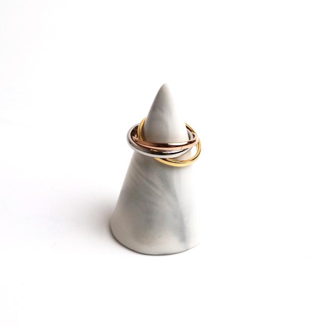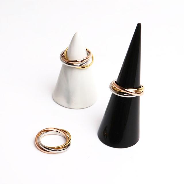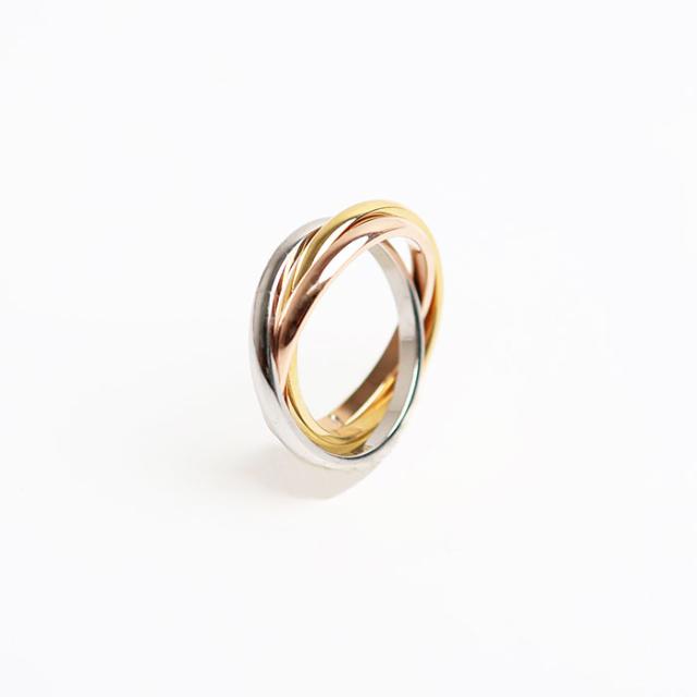 変色しにくい、変形しにくい、傷が付けにくい 金属アレルギーに強いステンレスの指輪です。 手元にモダンな存在感をプラスするトリプルツイストのリング。 3つのメタルリングが重なったデザインが洗練された手元を演出してくます。 |
