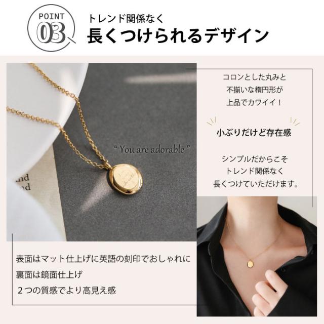 「You are adorable.」 ”あなたは可愛らしいね。” 変色しにくい、変形しにくい、傷が付けにくい、 金属アレルギーに強いステンレスのネックレスです。 長さ調整可能なアジャスターが付き、好みに合わせてつけることができます。 日常使いからフォーマルな場面まで様々な場面で活躍してくれます。 |